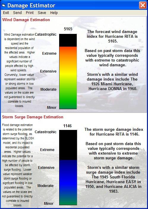 The Damage Estimate Report is designed to analyze a storm's forecast overall damage potential. It can also be run after the storm has had an impact to help determine the extent of damage which may have occurred. The calculation of the Damage Estimate Index uses the force of the wind and the height of the estimated storm surge... along with the population of the area(s) affected and the real estate values in those areas.. The absolute value of the index has no meaning and is used only to compare to past storm's index values. Since the population of the area is critical, it is possible to have a Category 5 storm impacting a low population density area have an Damage Index value lower than a Category 1 storm impacting a densely populated area.