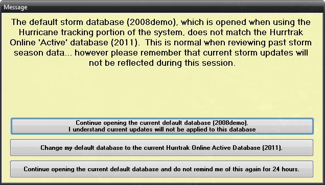 2. When the default and Hurrtrak Online databases do not match the system will present the user with an opening message informing them of this situation and providing options to continue, change the default database or disable this warning message for 24 hours. Be aware that if you choose to continue in this condition, any storm data coming in from Hurrtrak Online will not be reflected during the session. This includes the notices that indicate new storm data has arrived for a storm.