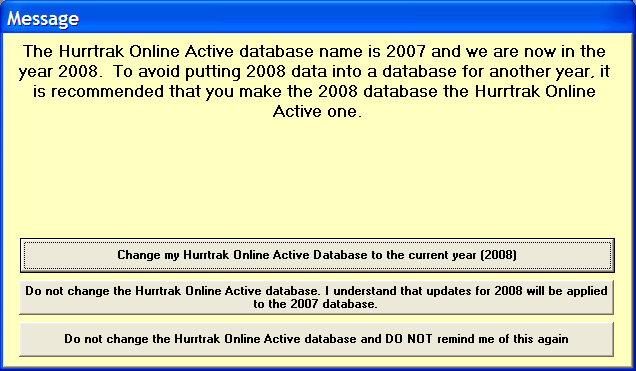3. Finally, if the Active Hurrtrak Online Database is not in the current year.. The system will warn the user when opening the main tracking program of this condition and provide the option of changing the Active database to the current year. This should reduce the chances that data from one year will be stored into the wrong database.