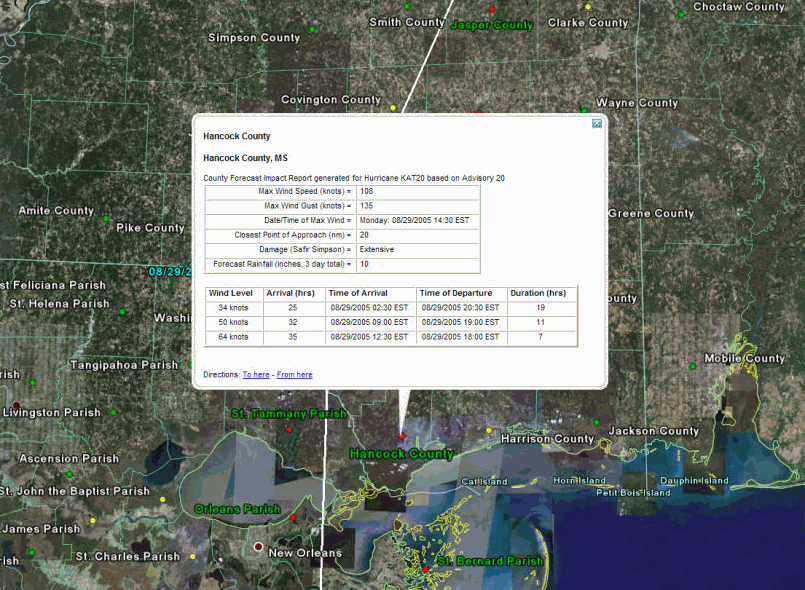This option allows the user to export the location, county or zip code summary reports as well as wind probability and surge reports to Google Earth. When selected Google Earth will automatically start and display the report data on it's interface. Google Earth is required on the user's workstation for this function to work.