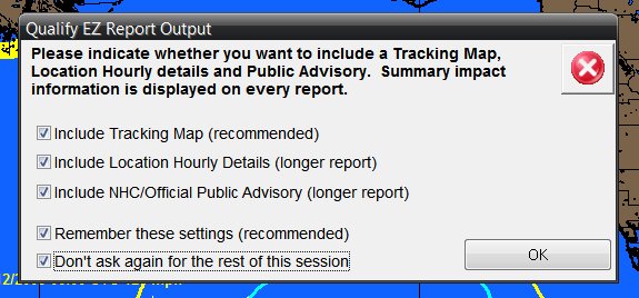 It allows the user to select the portions of the report they would like to include. As indicated above, the report can optionally include a tracking map, the location's hourly impact details (in addition to the summary impact which is included by default), and the Public Advisory text. By selecting the bottom option, the user will not see this screen again for the remainder of the session.