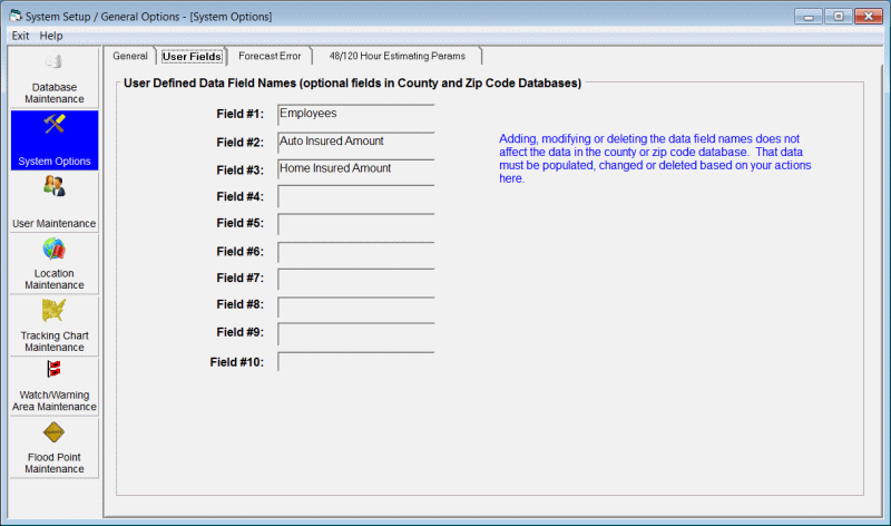 This option allows the user to establish up to 10 additional data fields that relate to county and zip code. There are up to 3 extra user data fields (10 in Advanced & RM/Pro) that can be defined in the user in the County and Zip Code databases. This option allows the user to enter the name/description of these "extra" data fields. Care must be taken when establishing these as changing the fields later requires the data in the County and Zip code databases to be reinitialized for this data. For more information see the County or Zip code data maintenance section.