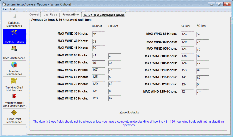 This option allows the user to vary the estimating parameters used to determine the likely areas of 34, 50 and 64 knot winds at the 48, 72, 96 and 120 hour forecast positions.