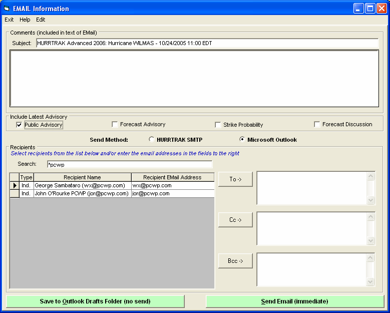 Subject - The information you would like to appear in the subject line of the Email note. It defaults to the current storm name but can be overwritten.