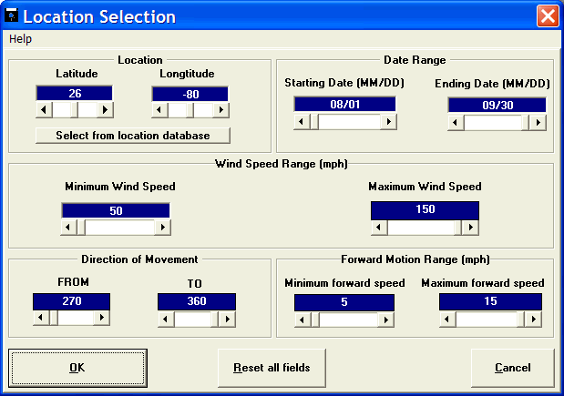 The following optional data fields are initially set to their widest ranges. If you wish to "narrow" the number of storms selected you may modify their values. They include:
