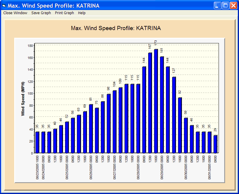 This window displays the selected storms max wind speed profile. Max and Min wind speed is indicated by the horizontal dashed lines. The unit of measure, MPH or KNOTS, is determined by the user options set in the tracking portion of the system.