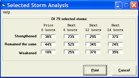 This option is only active when a group of storms have been selected via the "select storms by location" method. It displays the storm group trend information indicating what percent strengthened, weakened and remained the same for the prior 6 hours, next 6, 12 and 24 hours. This is useful when using the system to compare the historical data to a current storm situation.