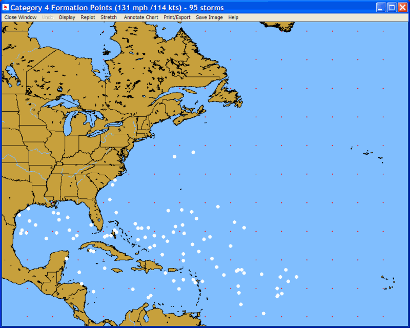 This window displays the results of the formation point select query. It shows a white circle for every storm that attained the level as specified in the selection.