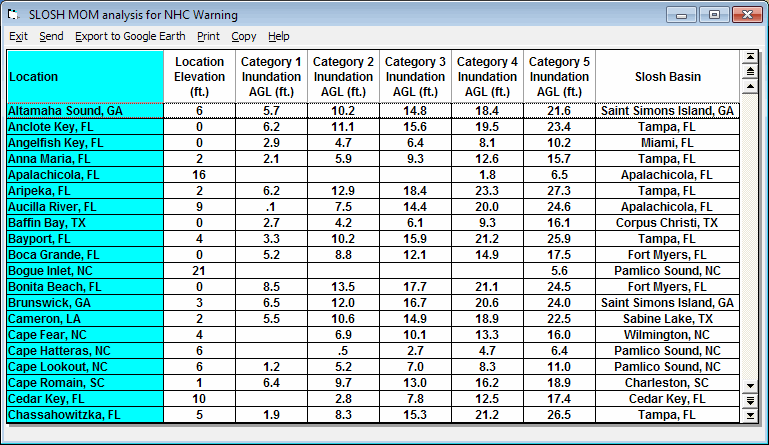 SLOSH REPORT show the potential inundation levels (ft ASL) for specific locations.