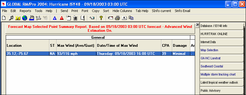 Description: This tab displays the forecast or actual impact summary report for the point selected (via map). The location name is the latitude and longitude of its location. The report is generated by examining the selected point and determining the forecast or actual wind impact to that location. The report shows the location name, state, maximum wind speed (sustained/gusts) expected, day/date/time of maximum wind speed, closest point of approach (CPA), damage estimate and the arrival time, first time, last time and duration of 34, 50 and 64 knot winds. See National Hurricane Center wind radii considerations for more information on the limitations of forecast/observed wind radii. If advanced wind estimation (AWE) is ON, that will be indicated in the report heading. See Advanced Wind Estimation for more information.