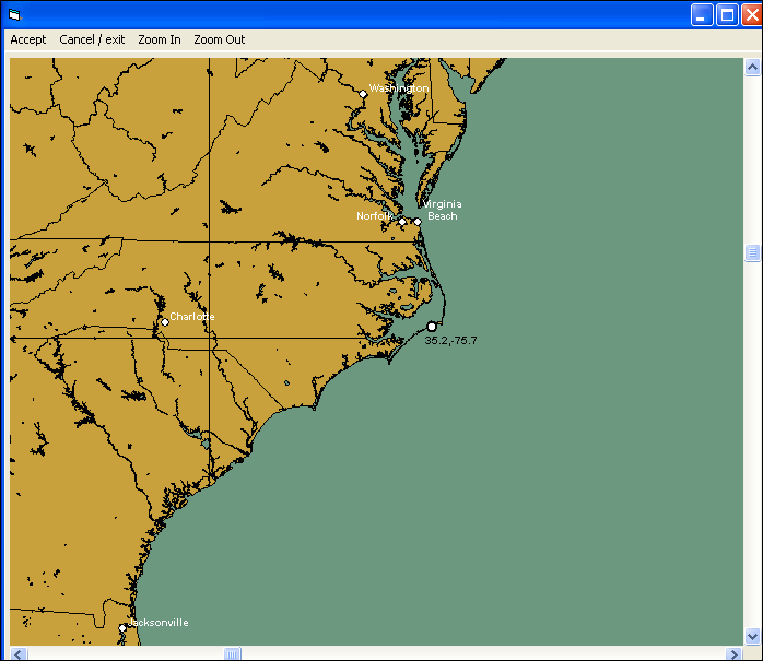 When the Forecast or Actual Map Selection Report is selected the user is presented with a map where a point can be select by left clicking your mouse button. When satisfied with the point selected, choose the accept option and the location report tab will be displayed.