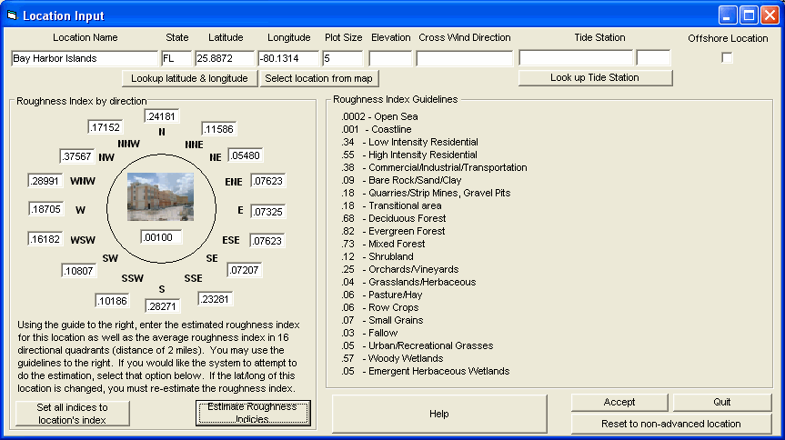 Roughness Index (by direction) - This is an important data element. It describes the exposures that are characteristic for this location. For each of the 16 compass directions the average roughness index for 2 NM in this direction is shown. These values have been pre-calculated for the default locations. If you add a new location and do not choose the "Estimate Roughness Index" option, the system will prompt the user to automatically calculate the roughness indices upon exit of this screen. If you update a location's position (Lat, Long), the user should select the "estimate roughness indices" option. These value has a significant impact on the wind speeds estimated by Advanced Wind Estimation.