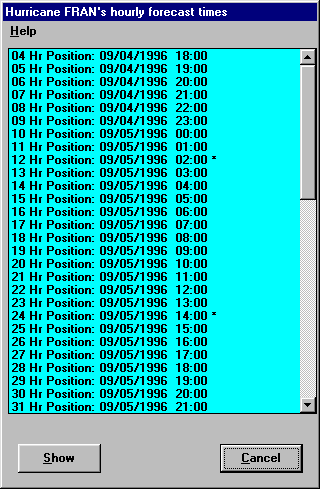If the user would like to view the storm's position "in-between" official NHC verification times, they will be presented with a list of possible times.