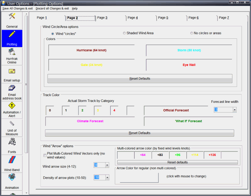 This option allows the user to control the color of the hurricane, storm and gale wind fields as well as the color of the eye wall