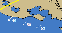 Wind Field - Displays a pattern of wind arrows that indicate the likely wind speed and direction at that point. You may also "force" a wind arrow plot by clicking the left mouse button while over a point on the chart. Wind field arrows are only shown for areas that fall within the radius of 34, 50 and 64 knot winds. The size, density, color of the arrows as well as the text properties of the wind value are set in Options.