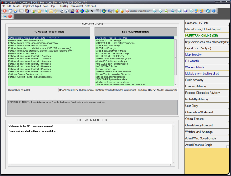 Description: This tab allows the user to manually retrieve information via the HURRTRAK ONLINE service. The user can select from a PCWP data list (Hurricane info) or a 'Non pcwp list" which contains links to Internet sites. This tab also indicates when the storm databases were last updated and when they are scheduled to be next updated.... as well as some other informational type data.