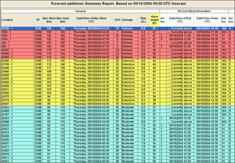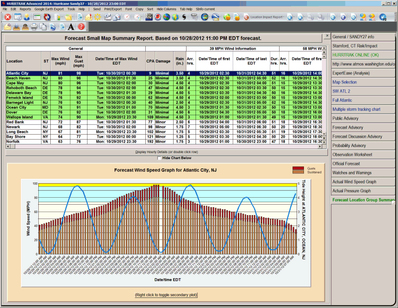 report shows the location name, state, maximum sustained wind speed expected, maximum