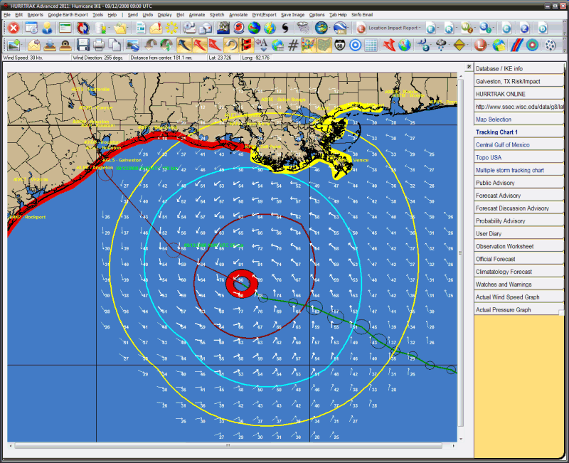 Left Clicking on a tracking map will display either the current wind vector (arrow) for the mouse position or the forecast wind speed for that location. This is controlled by toggling a toolbar button which is located on the primary toolbar.