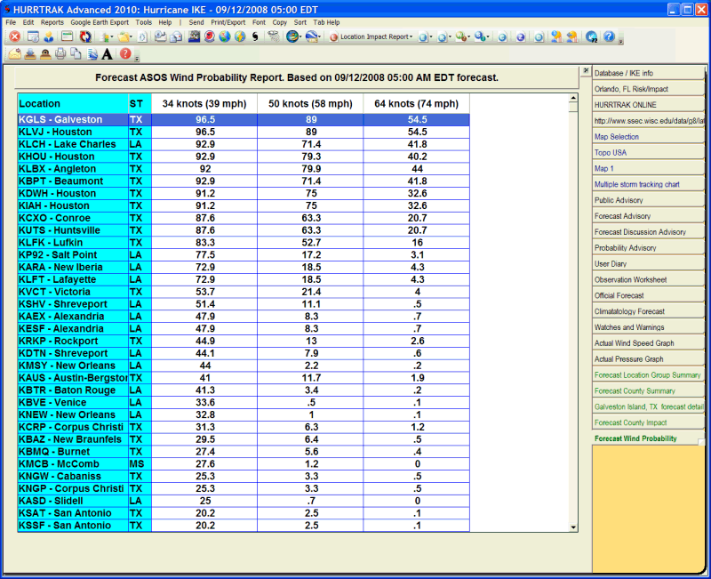 Description: This tab displays a report showing each location and the probability of sustained 34, 50 and 64 knot winds.