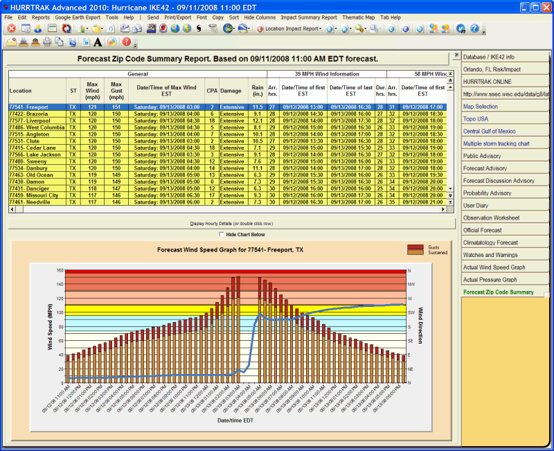 Description: This tab displays the forecast or actual impact summary report for the zip codes specified in Impact Analysis Option.This report is generated by examining every zip code and determining the wind impact to that area. The report shows the zip code, city name, state, maximum wind speed expected (sustained / gusts), day/date/time of maximum wind, closest point of approach (CPA) and the arrival time, first time, last time and duration of 34, 50 and 64 knot winds. See NHC wind radii considerations for more information on the limitations of forecast wind radii. The zip codes that are examined are determined by the settings in Impact Analysis Options. If advanced wind estimation (AWE) is on, it will be indicated in the report header. The graph portion shows the wind speed forecast over time along with the tide harmonic and/or the wind direction. The tide/wind secondary plot change be cycled by left clicking on the chart.