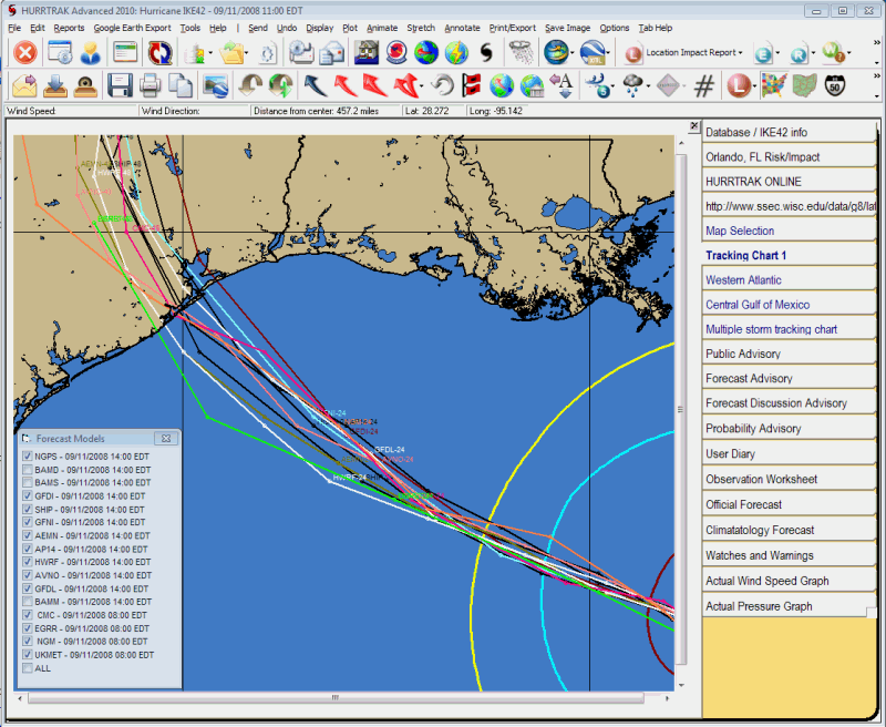 The HURRTRAK software coupled with HURRTRAK ONLINE allows the use to depict that latest available Hurricane Model Forecast. A complete discussion on the various hurricane models that the NHC utilizes is at http://www.nhc.noaa.gov/modelsummary.shtml . A copy of this is shown below.