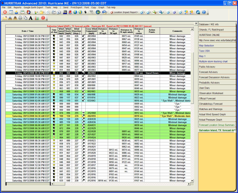 Description: This tab displays the hourly detail report for locations, counties and zip codes. When a location, county or zip code is selected, the system examines the actual storm characteristics for every hour of the storm's life making a determination of how this location was affected at each hour. The result is a report indicating the wind speed (sustained/gusts) and wind direction conditions for this location throughout the period along with any other pertinent information such as astronomical tide height, distance from 34, 50, 64 knot wind areas and distance from center. The last column indicates whether the location was affected by the eye and/or eye wall. In addition, if the cross wind flow angle has been set for this location, the cross wind component is included. If advanced wind estimation (AWE) is on, it will be indicated in the report header. The 2nd sample image above is included to show an example of a report for an oil platform during Hurricane Ivan. Note for this type of offshore location, wave height is also included on the report.