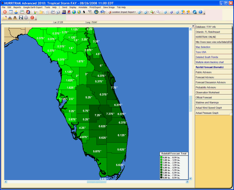 Description: This tab displays the National Weather Service's official daily hour rainfall for the next 3 individual days, 3 day total, 5 day total or 7 day total in a county thematic fashion. Additional tracking and analysis functions are available from here.