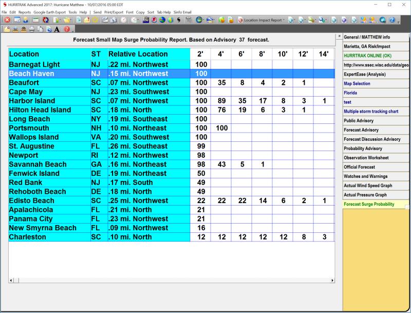 Description: This tab displays a report showing each location and the probability of a storm surge from 2 to 25 in 2 increments. It also shows the relative position to the reported position (< 1/3 mile) that this surge value is valid for.