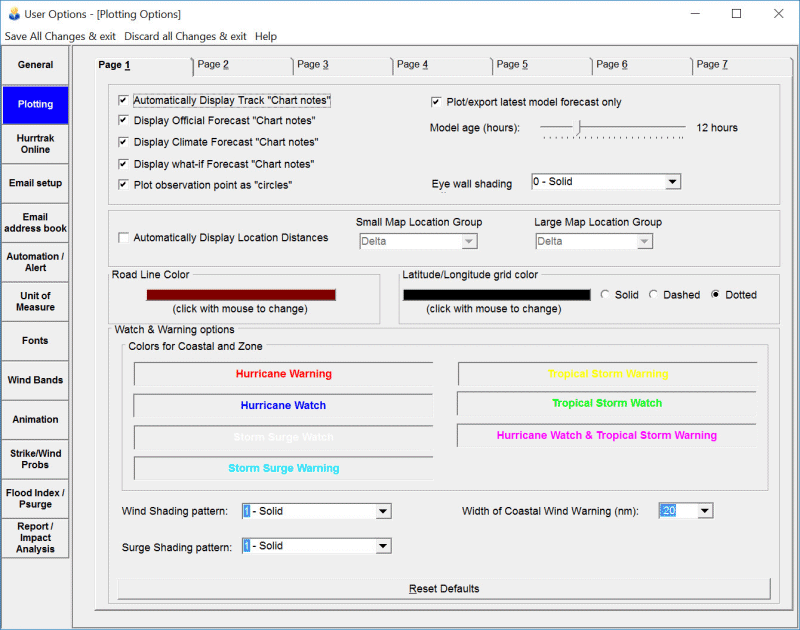 This option allows the user to modify the colors of the Watch and Warning Areas as well as define the pattern to use for Wind watches and warnings and Storm Surge watches and warnings. Also included in this area is the plot width of the coastal watches and warnings.