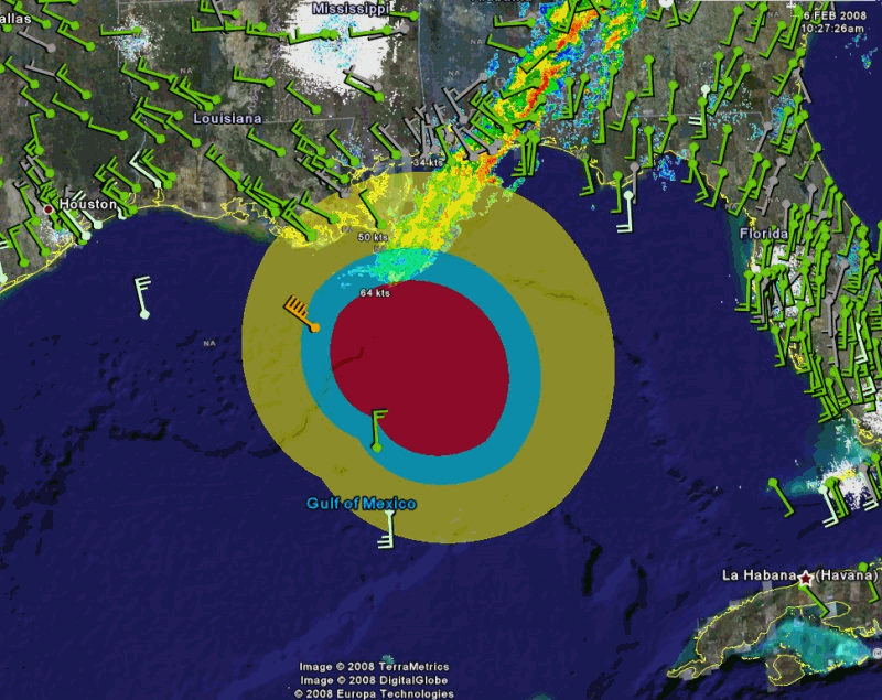 It allows the user to export National Weather Service and other weather information to display on Google Earth. This data includes radar, satellite, wind, temperature, dew point, river stages and more! When this information is displayed with Hurricane layers exported from the Hurrtrak system the user is able to view both storm and "weather" information on the same Google Earth image. An example of hurricane wind radii superimposed with radar and wind data is shown below.