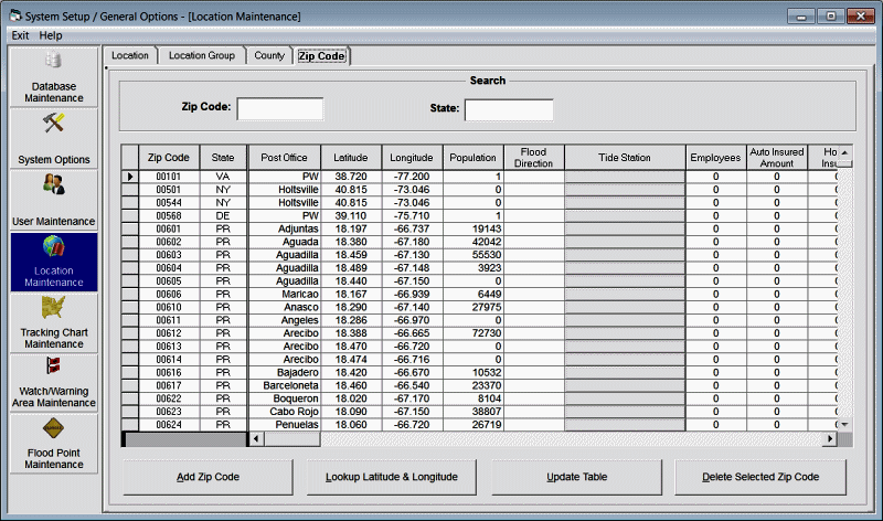 This option allows the user to establish new or change/delete existing zip codes. The latitude and longitude values are the geographical center position of the zip code. Remember western longitudes are negative while eastern longitudes are positive. The Advanced & RM/Pro versions of the system uses the zip code information in its impact analysis.