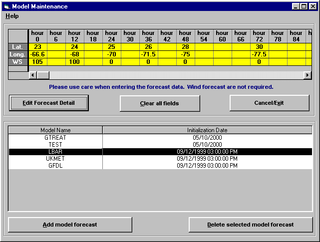 To Add a new forecast, select Add Model forecast. You will be prompted for the name of the model, initial Data/Time (ENTERED IN UTC TIME ONLY), and initial latitude and longitude. After entering this data a forecast record will be shown on the grid. It will need to be edited to include forecast information.