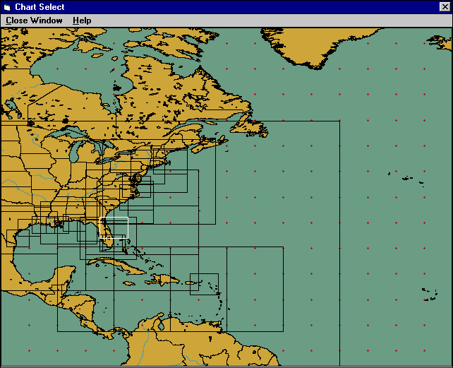 This option places a large scale tracking chart in a window on the screen. The user can select the tracking chart they want to view by moving the cursor over the black "rectangles" that represent all of the available tracking charts. When the desired rectangle is highlighted, clicking the left mouse causes this chart to be selected