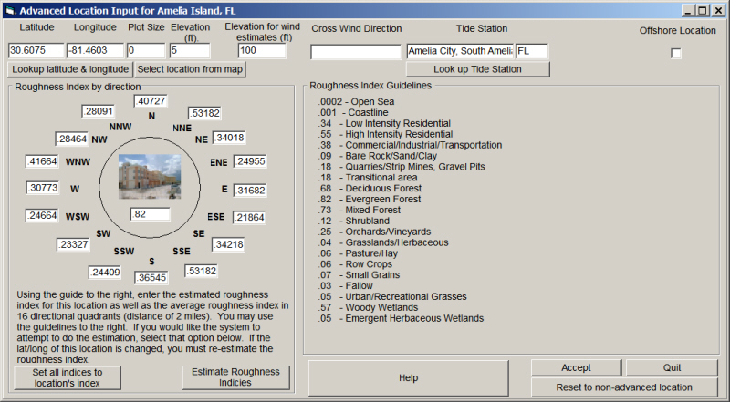 Roughness Index (by direction) - This is an important data element. It describes the exposures that are characteristic for this location. For each of the 16 compass directions the average roughness index for 2 NM in this direction is shown. These values have been pre-calculated for the default locations. If you add a new location and do not choose the "Estimate Roughness Index" option, the system will prompt the user to automatically calculate the roughness indices upon exit of this screen. If you update a location's position (Lat, Long), the user should select the "estimate roughness indices" option. These value has a significant impact on the wind speeds estimated by Advanced Wind Estimation.