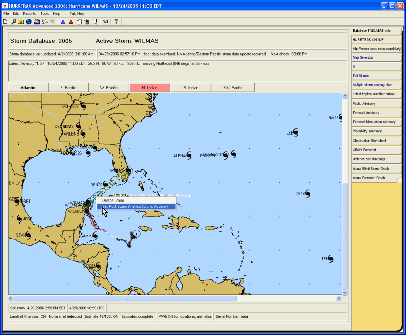 With the Database Tab, a right click over an observation allows you to set that advisory as the Post Storm Analysis point. If you happen to point at a storm, you can also delete the storm from the database.