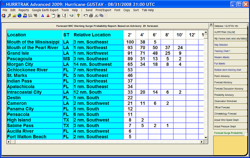 Storm surge probabilities are processed by NOAA and are available about 1 hour after the official advisory time. For example, the advisory issued at 11 AM EDT will not have surge probabilities until about Noon EDT. The information is downloaded and processed by the Hurrtrak Online Servers and delivered to you system as soon as possible. You can view surge probabilities in either graphic or report format.
