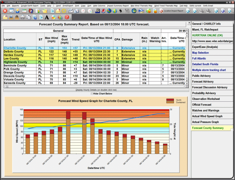 Description: This tab displays the forecast or actual impact summary report for the counties specified in Impact Analysis Option. This report is generated by examining every county location and determining the wind impact to that location. The report shows the county name, state, maximum wind speed expected (sustained / gusts), forecast wind trend, rainfall, best estimated damage, warnings, day/date/time of maximum wind, closest point of approach (CPA) and the arrival time, first time, last time and duration of 34, 50 and 64 knot winds. See National Hurricane Center wind radii considerations for more information on the limitations of forecast wind radii. If advanced wind estimation (AWE) is on, it will be indicated in the report header. The graph portion shows the wind speed forecast over time along with the tide harmonic and/or the wind direction. The tide/wind secondary plot change be cycled by left clicking on the chart.