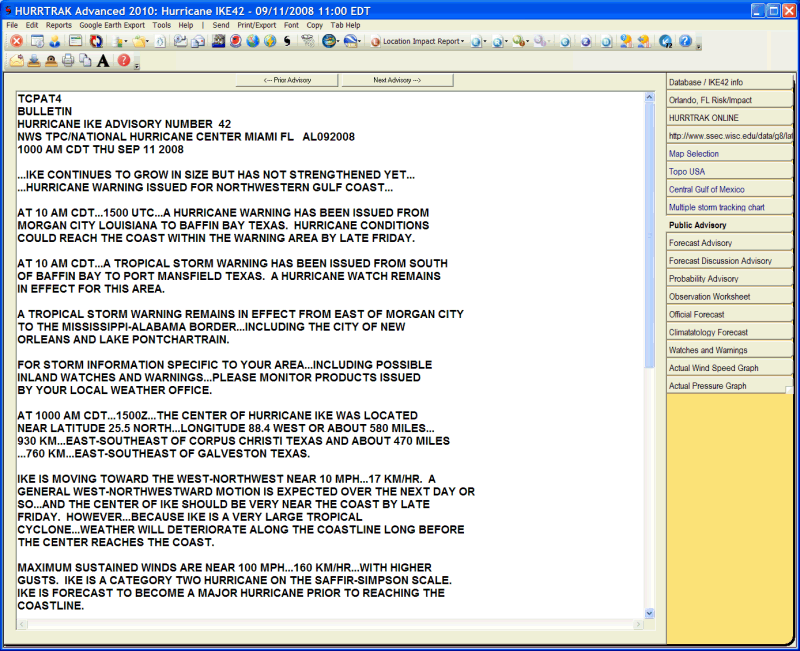 Description: This tab displays the latest National Hurricane Center Public Advisory for the current loaded storm.