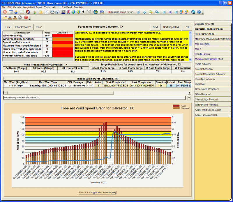 surge probabilities, wind impact summary / detail and a forecast wind speed and direction