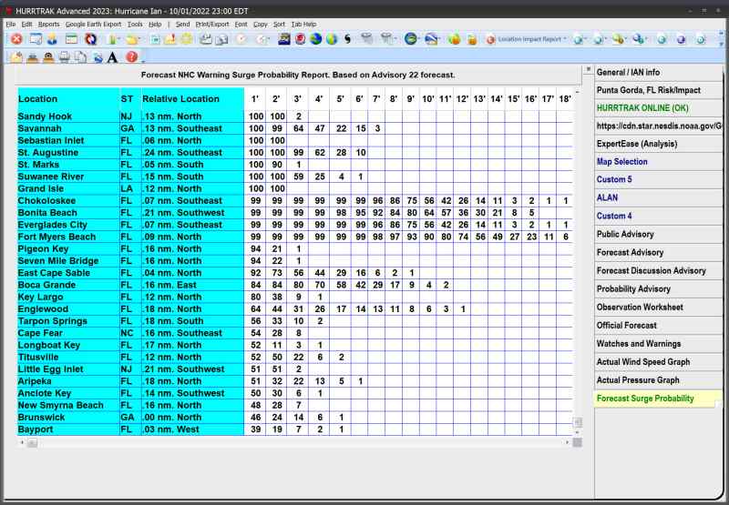 Description: This tab displays a report showing each location and the probability of a storm surge from 1' to 25. It also shows the relative position to the reported position (< 1/3 mile) that this surge value is valid for.