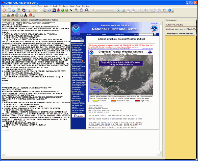 Description: This tab displays the latest retrieved tropical weather outlook text and NHC graphic.