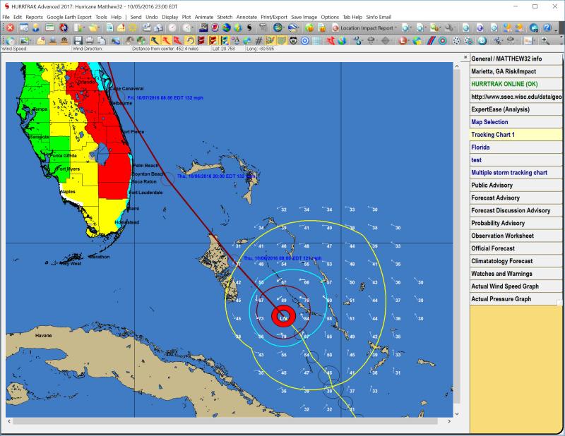 Description: This tab displays the map selected from the map selection tab or when a map is re-plotted due to pan and zoom.. Many storm tracking and analysis functions are available from here. Up to three of the variable tracking chart tabs are available. There maps are dynamic and are not part of the system's permanent (fixed/favorite) tracking chart selection.