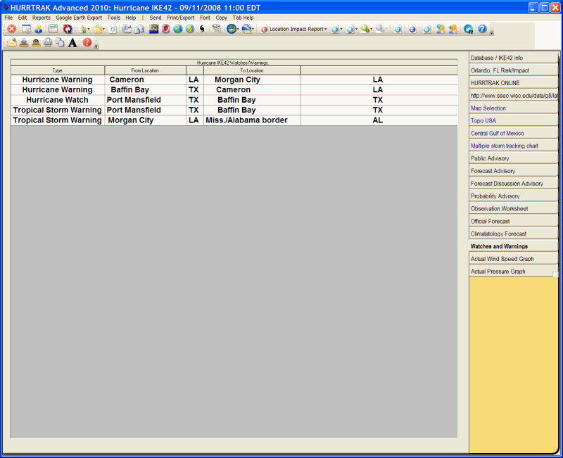 Description: This tab displays the latest watch and warning data for the current loaded storm.
