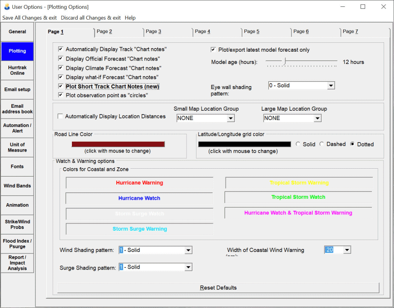 This option allows the user to modify the colors of the Watch and Warning Areas as well as define the pattern to use for Wind watches and warnings and Storm Surge watches and warnings. Also included in this area is the plot width of the coastal watches and warnings.